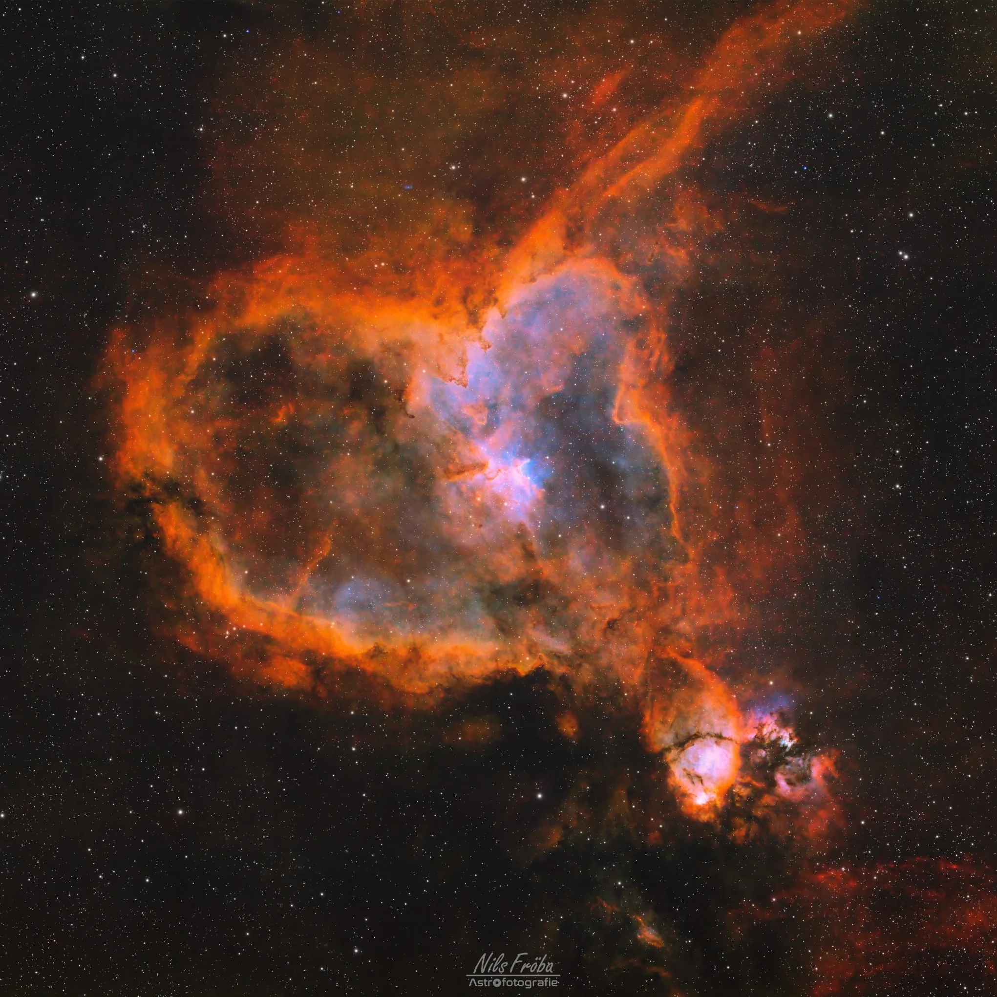 Im Zentrum des Herz Nebels liegt der offene Sternhaufen Melotte 15. Seine Strahlung und Sternwinde formen das umgebende Gas zu beeindruckenden Filamenten und Hohlräumen. Im rechten unteren Bereich befindet sich IC 1795, auch Fischkopfnebel genannt. Dieses aktive Sternentstehungsgebiet ist reich an Gas und Staub und eng mit dem Herznebel verbunden. Es zeigt faszinierende Details und dunkle Strukturen, die sich deutlich vor dem leuchtenden Wasserstoffhintergrund abheben.